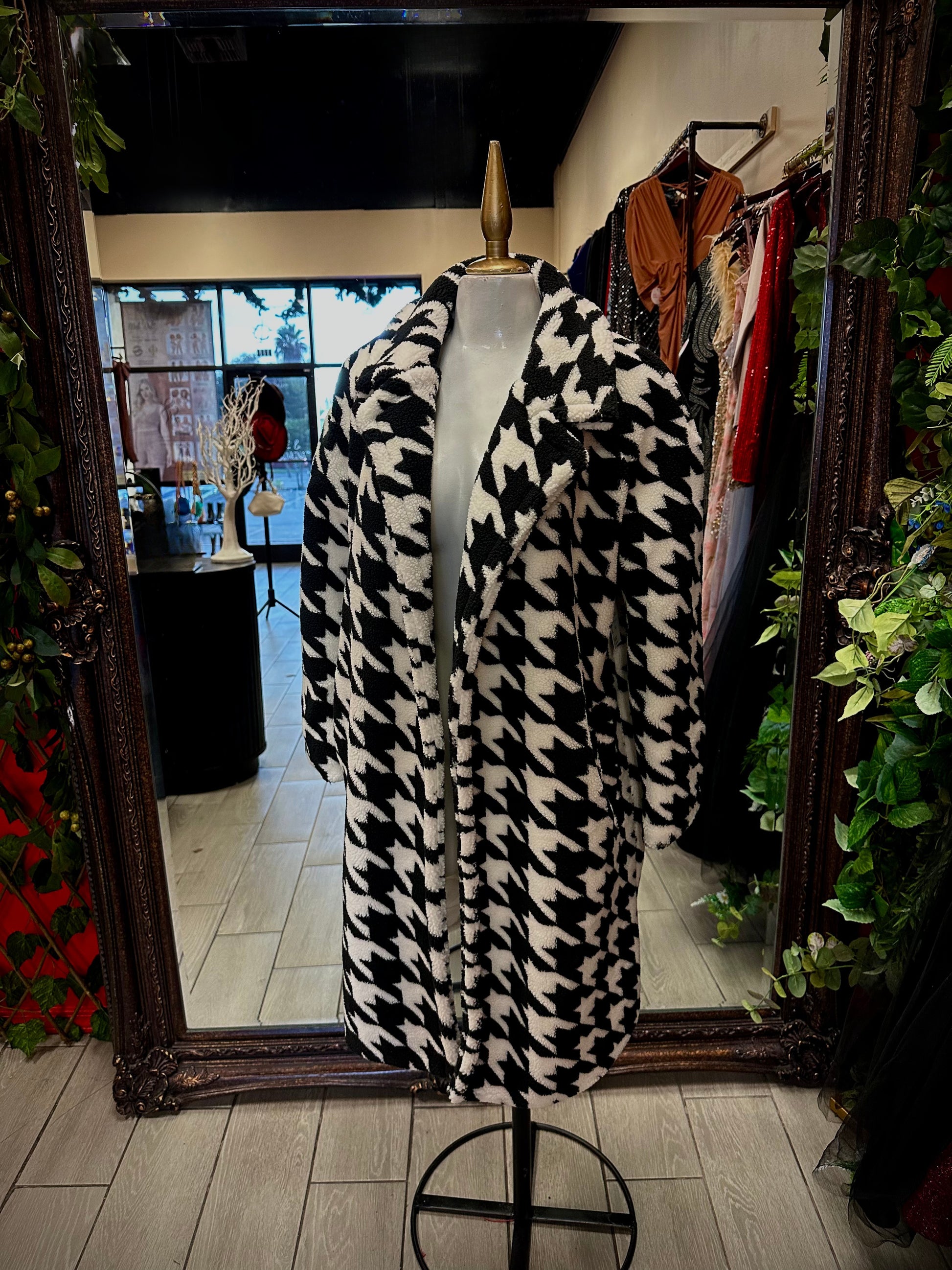 A statement long trench coat crafted in a soft black and white fuzzy texture, blending timeless tailoring with cozy sophistication. Designed to elevate any outfit, this piece adds effortless drama and warmth to your wardrobe.