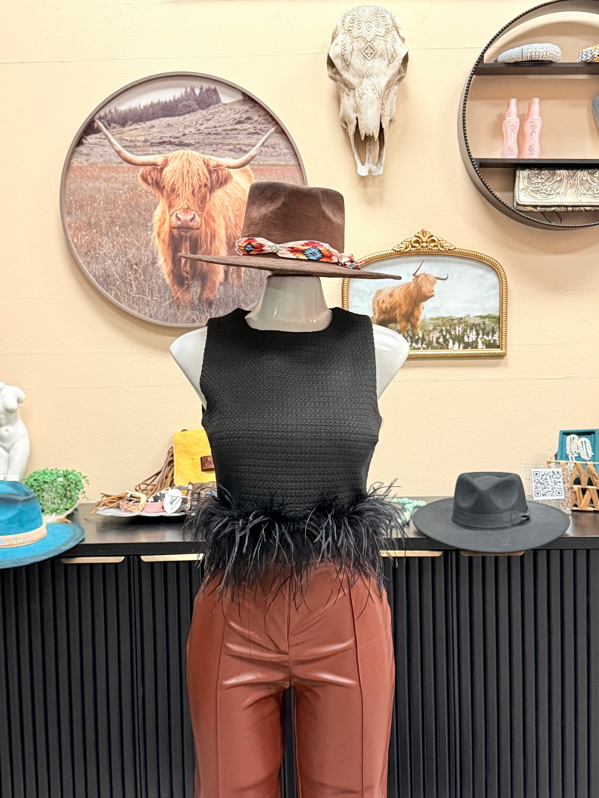 This sleeveless cropped top features a textured fabric finished with a dramatic feather trim along the hem. Bold yet elegant, it’s designed to add movement and standout style to any look.