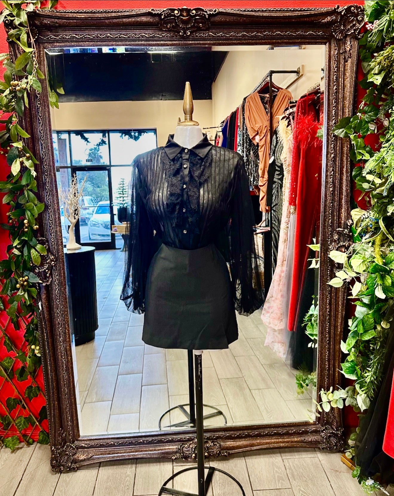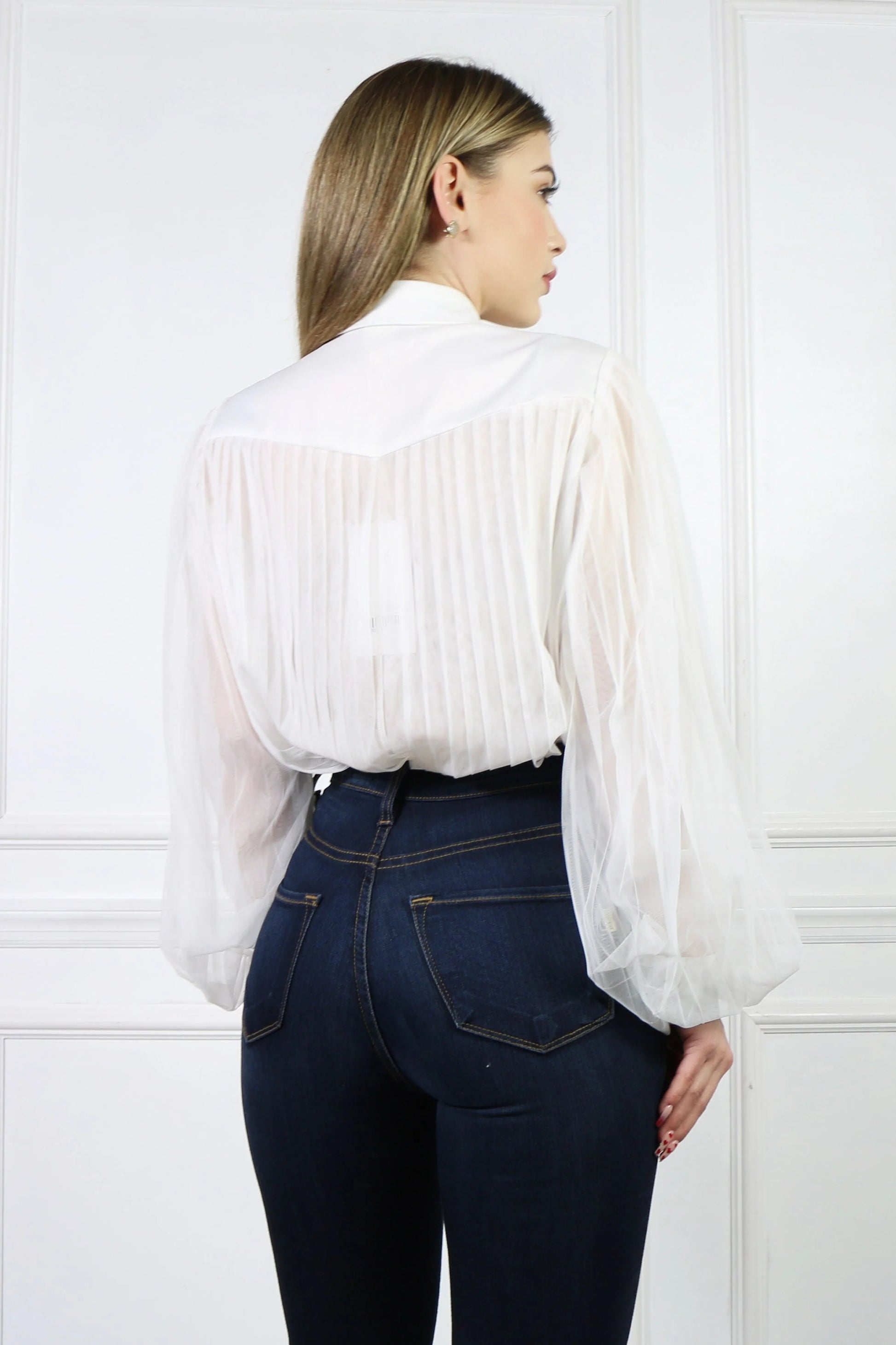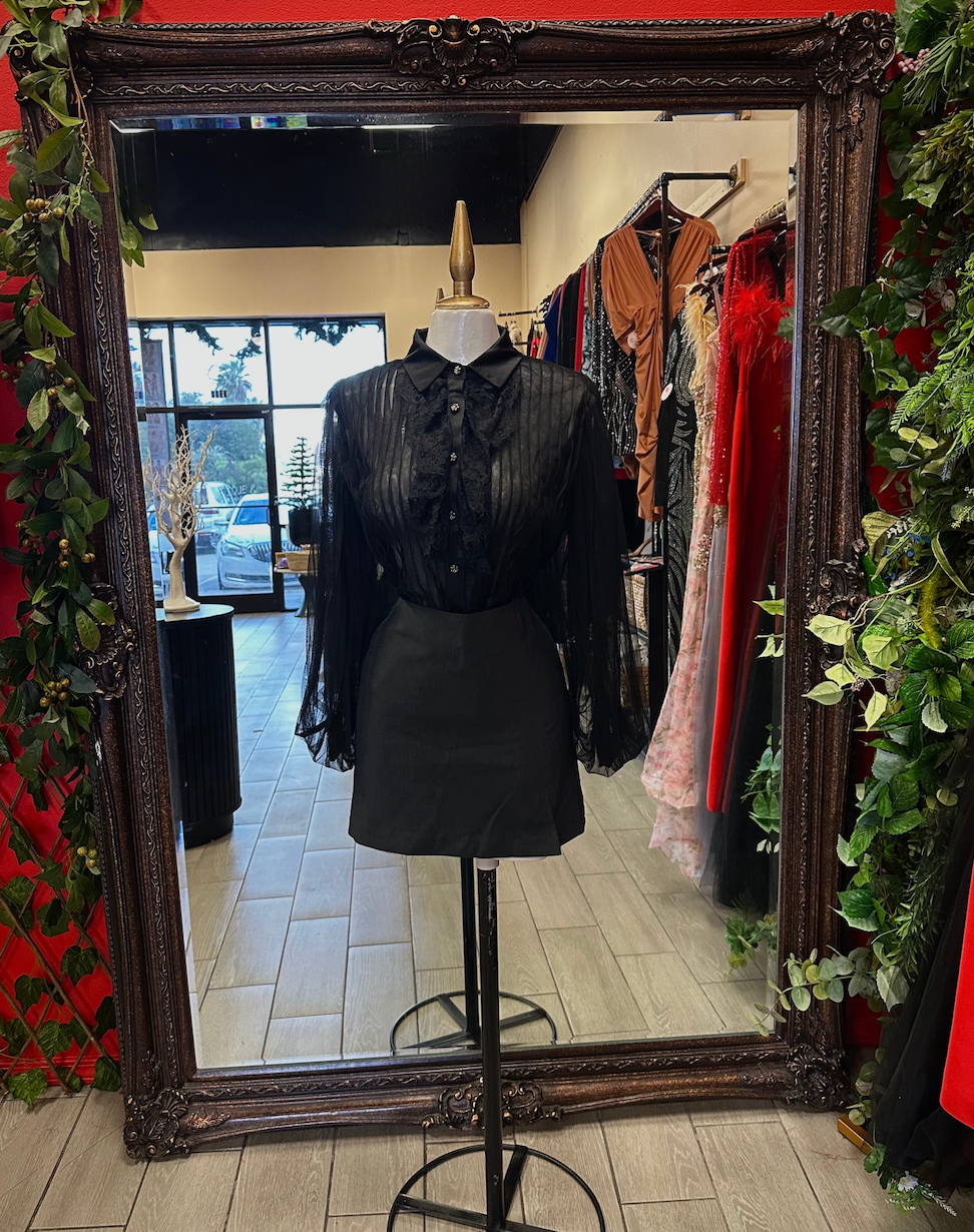 This sheer long-sleeve button-up top features delicate ruffle detailing and eye-catching unique buttons for a refined, feminine look. Designed with soft color accents, it adds effortless charm and sophistication to any outfit.