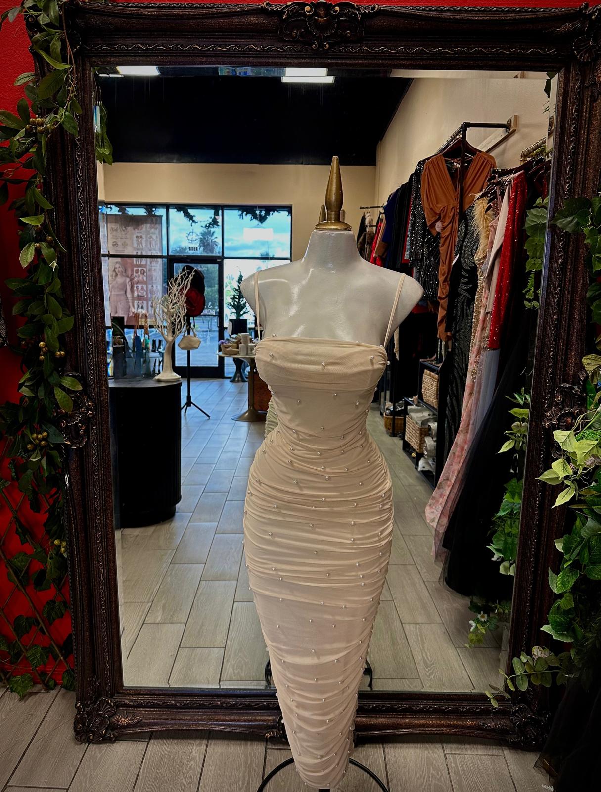 This stunning nude midi dress features a flattering ruched silhouette with delicate pearl embellishments throughout. Designed with thin straps and a body-hugging fit, it offers timeless elegance perfect for formal events, weddings, or special evenings out. Sophisticated, feminine, and effortlessly chic.